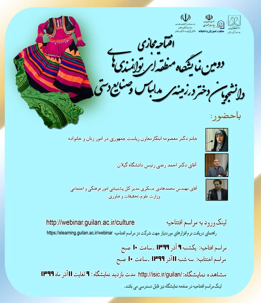دومين نمايشگاه منطقه اي توانمندي هاي دانشجويان دختر در زمينه مد، لباس و صنايع دستي به صورت مجازي با ميزباني دانشگاه گيلان و مشارکت دانشگاههاي دوازده گانه مناطق (مازندران، گلستان، خراسان شمالي، خراسان رضوي، قزوين، زنجان، آذربايجان غربي، آذربايجان شرقي، اردبيل، سمنان، تهران و قم) با هدف بهره گيري از تمام ظرفيتهاي موجود و ممکن در دانشگاهها، افزايش غرورملي، ارتقاء توانايي ها و مهارتهاي دانشجويان دختر وايجاد زمينه هاي ورود آنان در فضاي کسب و کار، در تاريخ نهم آذر ماه 1399 به مدت سه روز برگزار خواهد شد.