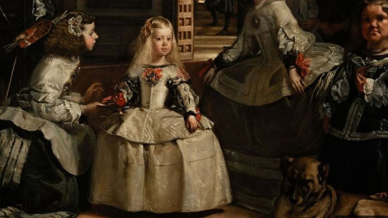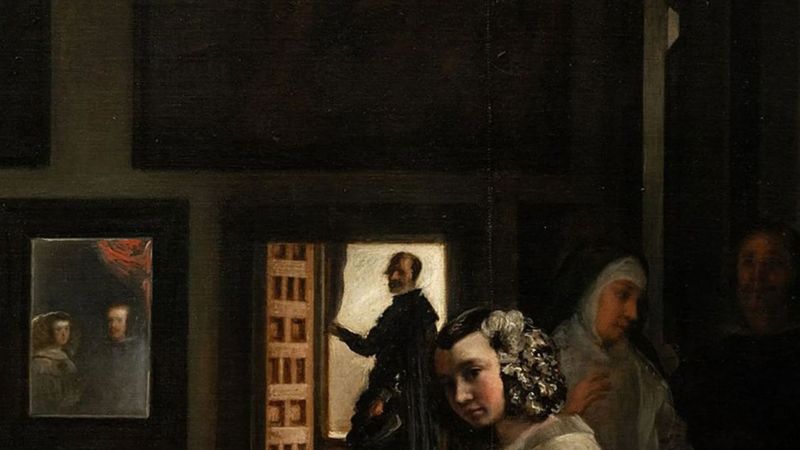 در پيشزمينه، شاهزاده مارگارت ترزا را ميبينيم، دخترک پنج ساله پادشاه فيليپ و ملکه ماريانا. در سمت راست، دو خدمتکار کوتاهقد حضور دارند. يکي به بازيگوشي روي پنجه پايش مشغول است و زن مسنتر به ما چشم دوخته است و اين حس را تقويت ميکند که با همان دقتي که ما نقاشي را زير نظر داريم، نقاشي هم هر حرکت ما را ميپايد. در پسزمينه، دو خدمتکار درگوشي نجوا ميکنند. حاجب ملکه دارد از در پشتي خارج ميشود اما پيش از خروج مکثي کرده است. شايد نگران است کسي دنبالش برود. در سمت چپ او در آينهاي، شاه و ملکه به شکلي محو تصوير شدهاند. گويي در آنِ واحد هم حضور دارند هم حضور ندارند و تماشاگر تابلو را به اين فکر مياندازد آنچه جريان دارد فراتر از چيزي است که ديده ميشود.
