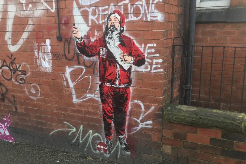 اين نقاشي ديواري به طرز دلخراشي بابانوئل را به عنوان يک توزيع کننده Big Issue نشان مي دهد ؛ اين شغلي است که معمولاً براي کمک به افراد بي سرپرست براي گرفتن نوعي دستمزد داده مي شود و از اين نظر کاملاً چشمگير است.