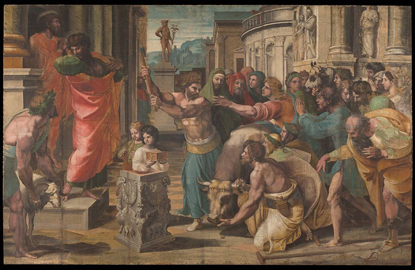 پاپ لئو دهم در سال 1513، رافائل را براي اجراي ده طرح در اندازه کامل براي مجموعه پرده هاي نگارين کليساي سيستين در کاخ واتيکان که صحنه هايي از زندگي مقدس پيتر و سنت پائول را به تصوير مي کشيد، منصوب کرد. پس از اتمام طراحي، آثار، که هريک به عرض 5 متر و ارتفاع 3.5 متر بودند به کارگاه نساجي pieter van aelst در بروکسل فرستاده شد تا طرح هاي ماندگار را به پرده هاي نگارين بدل کند. تا به امروز هفت اثر از اين مجموعه به جا مانده که در اوايل قرن هفدهم توسط شاهزاده ولز، و سپس چارلز اول به بريتانيا آورده شدند. اين آثار در مجموعه سلطنتي باقي مانده و در سال 1865 توسط ملکه ويکتوريا به مناسبت يادبود شاهزاده آلبرت، در موزه south kensington و اکنون در موزه V&A به امانت سپرده و از آن پس در اين موزه در معرض نمايش عموم گذاشته شده اند.