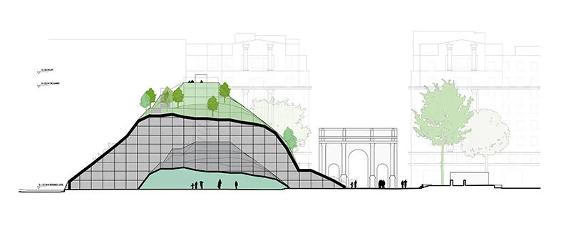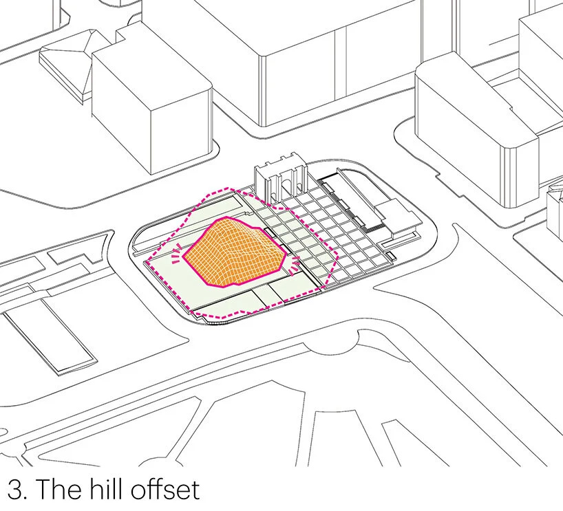 طبق توضيحات معماران بازديد کنندگان از مسيري مار پيچ از دامنه جنوبي تپه خود را به بالاي آن رسانده و سپس پايين مي روند تا به سالن بزرگي برسندکه فضايي ميان تهي در قلب تپه بوده و براي برگزاري رويدادها، نمايشگاه ها و ديگر مراسم مورد استفاده قرار مي گيرد. خروجي سالن در شکافي در گوشه تپه قرار دارد. ensures the temporary structure is offset from marble arch.