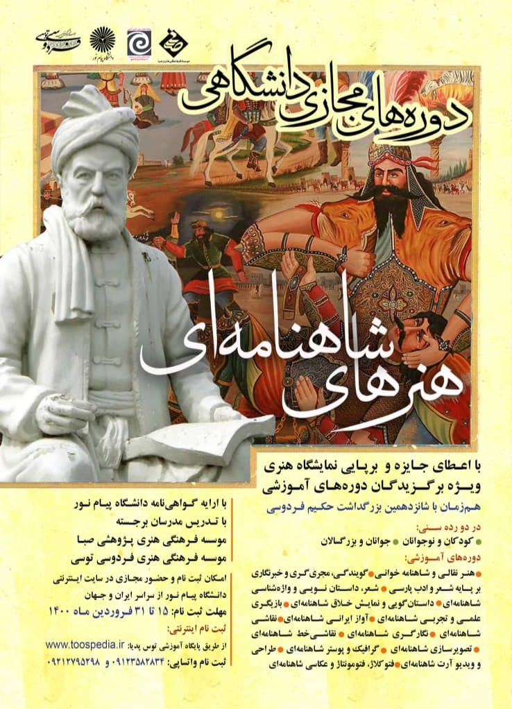 موسسه فرهنگي هنري پژوهشي صبا با همکاري موسسه فرهنگي هنري فردوسي توسي و دانشگاه پيام نور در ادامه دورههاي تخصصي آموزشي هنرهاي ايراني، کارگاههاي مجازي «تجلي روايتهاي شاهنامه در هنرهاي تجسمي» را با نام دورههاي مجازي دانشگاهي هنرهاي شاهنامهاي به صورت مجازي برگزار ميکند.