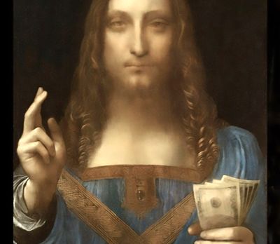 اما در نسخه رمز معاوضهناپذير که بن لوييس از گرانترين نقاشي دنيا کشيده، حضرت مسيح در دست چپ خود يک مشت دلار گرفته است. نسخه اصلي سالواتور موندي نوامبر ۲۰۱۷ در حراجي کريستيز در نيويورک ۴۵۰ ميليون دلار چکش خورد و قرار است نسخه ديجيتالي موسوم به NFT در تعطيليهاي عيد پاک در بريتانيا حراج شود.