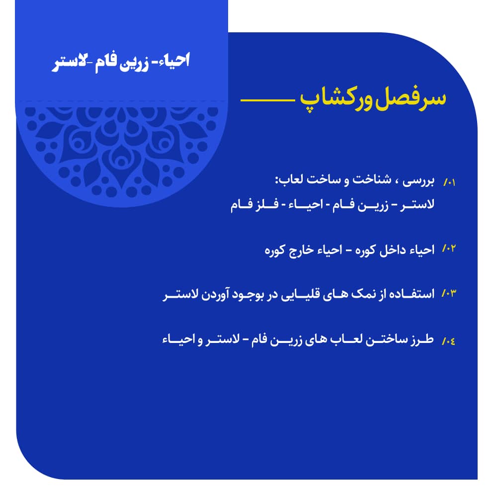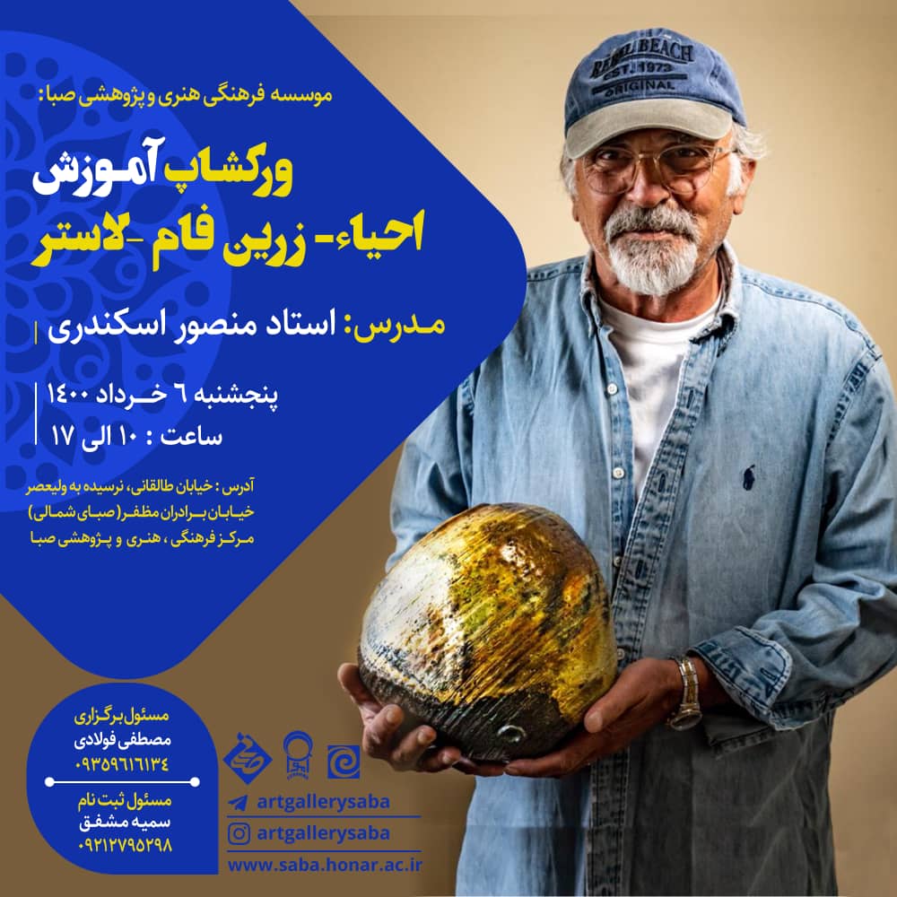 موسسه فرهنگي هنري صبا در ادامه کارگاههاي تخصصي هنرهاي سنتي، در ترم بهار۱۴۰۰ کارگاه يک روزه «آموزش احياء_زرين فام _لاستر» را با مديريت مصطفي فولادي و مدرس منصور اسکندري براي هنرجويان برگزار مي کند.
