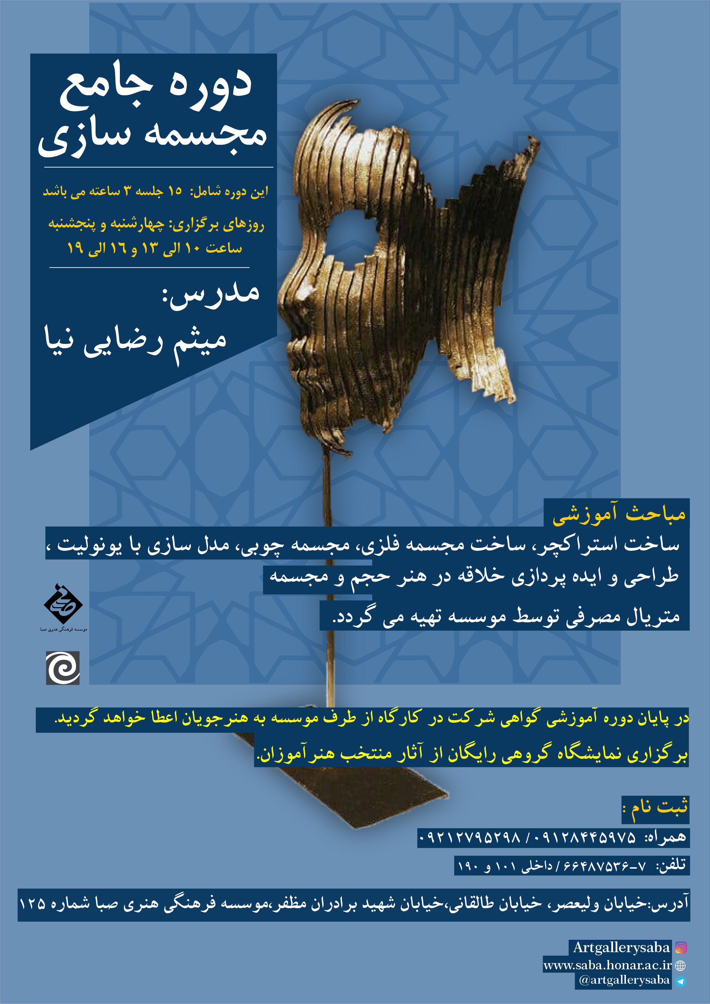 علاقه مندان جهت ثبت نام و اطلاع از نحوه برگزاري کارگاه با شماره هاي ۰۹۱۲۸۴۴۵۹۷۵ _ ۰۹۲۱۲۷۹۵۲۹۸ و تلفن ثابت ۷_۶۶۴۸۷۵۳۶ داخلي ۱۰۱ و۱۹۰ تماس حاصل نموده و يا به نشاني خيابان وليعصر، خيابان طالقاني، نرسيده به سينما فلسطين، ابتداي خيابان شهيد برادران مظفر پلاک ۱۲۵، موسسه فرهنگي هنري صبا مراجعه فرمايند.