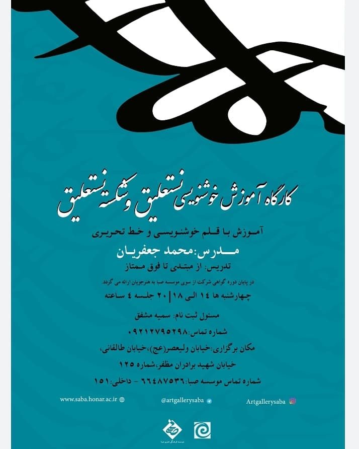 موسسه فرهنگي هنري صبا (وابسته به فرهنگستان هنر)، در ادامه برپايي کارگاهها و دوره هاي آموزشي تخصصي هنرهاي ملي، سنتي و اصيل ايراني، کارگاه آموزش «خوشنويسي نستعليق و شکسته نستعليق» را برگزار مي کند.