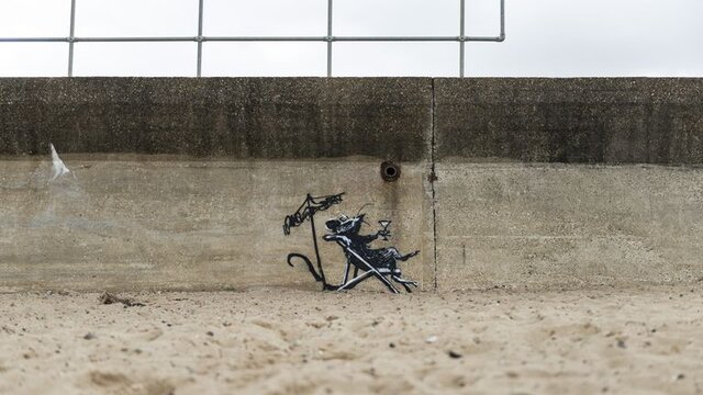 يکي از اين آثار هنري که بر روي ديواري در نزديکي يکي از سواحل بريتانيا نقش بسته، موشي را درحالي که روي صندلي و زير سايبان لم داده و نوشيدني در دست دارد، تصوير کرده است.