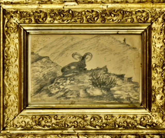 در مجموعه به نمايش گذاشتهشده، دو تابلو رنگ روغن در سالهاي پاياني زندگي ناصرالدين شاه کشيده شده که يکي از آنها ناتمام مانده و دستنوشتهاي روي اثر به اين شرح مشاهده ميشود: «اين پرده را در سنه ۱۳۱۳ هجري قمري شاه شهيد به دست مبارک ساخته و ناتمام مانده است.» در همان سال، ناصرالدين شاه ترور شد.
