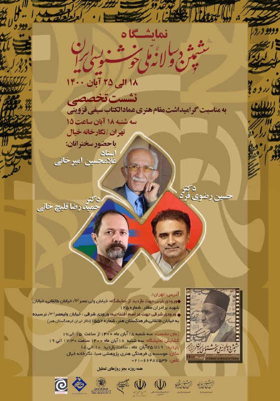 به گزارش گالري آنلاين به نقل از روابط عمومي موسسه فرهنگي هنري صبا- وابسته به فرهنگستان هنر- ششمين دوسالانه ملي خوشنويسي ايران، با گرد هم آوردن و کنار هم نشاندن چند نسل از خوشنويسان ايران از جوانان تا استادان برجسته و پيشکسوتان اين هنر و فن اصيل، با يک نمايشگاه و يک نشست بزرگ پژوهشي که به گراميداشت چهره فخرآفرين خوشنويسي ايراني: «عمادالکتاب سيفي قزويني» اختصاص دارد، روز سه شنبه 18 آبان 1400 در موسسه فرهنگي هنري پژوهشي صبا ، نگارخانه خيال تهران گشايش يافت.