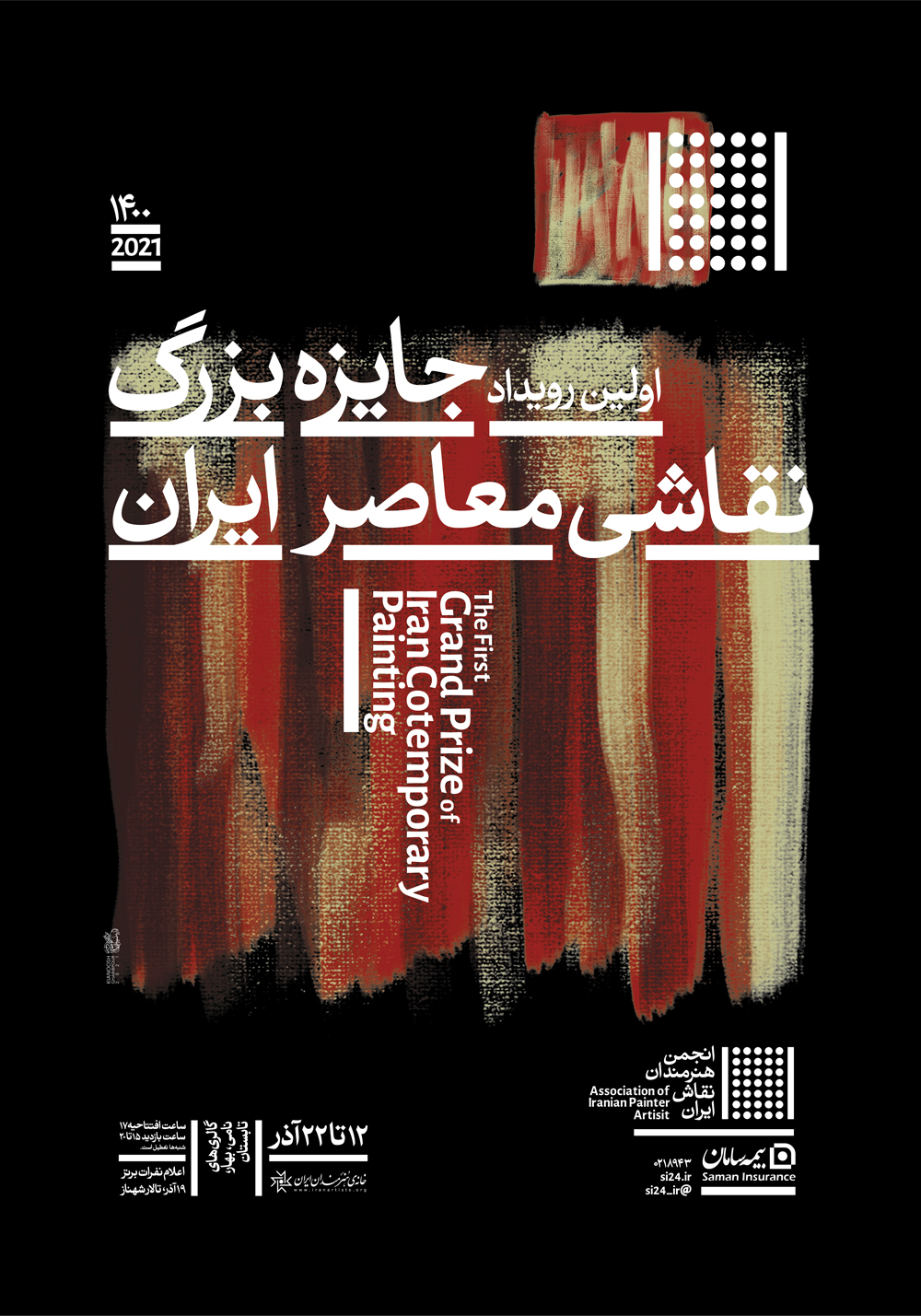 «شرکت بيمه سامان» و «انجمن هنرمندان نقاش ايران»، «اولين رويداد جايزه بزرگ نقاشي معاصر ايران» را در آذرماه ۱۴۰۰ با همکاري کارگروه رويداد و نمايش و دبيرخانه انجمن هنرمندان نقاش ايران برگزار مي کنند.