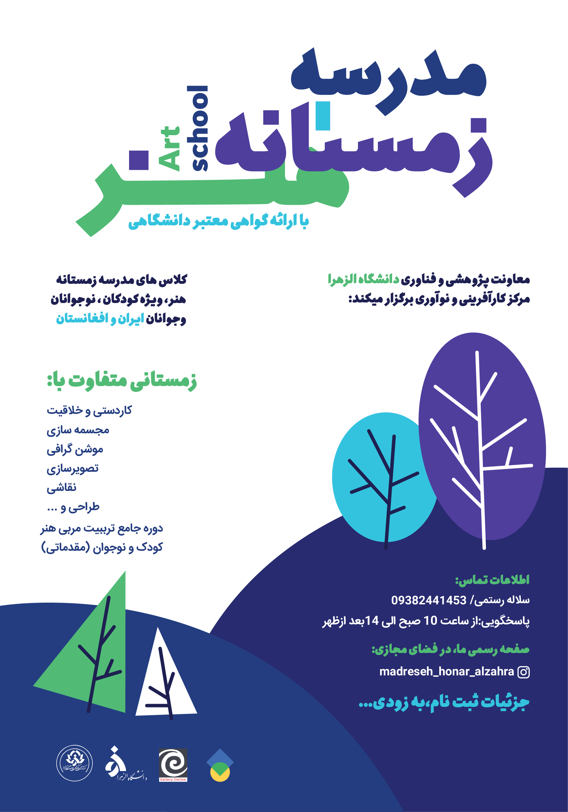 معاونت پژوهشي و فناوري دانشگاه الزهرا مرکز کارآفريني و نوآوري "کلاس هاي مدرسه زمستانه هنر را ويژه کودکان، نوجوانان و جوانان ايران و افغانستان برگزار مي کند.