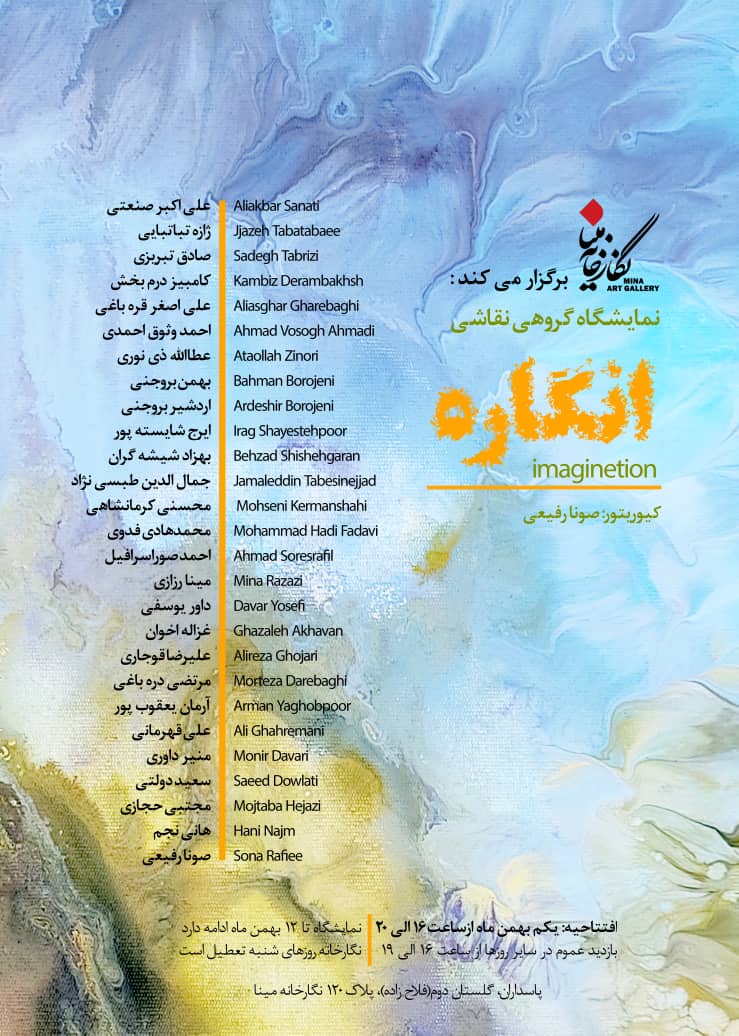 نمايشگاه گروهي نقاشي تحت عنوان "انگاره" به کيوريتوري صونا رفيعي از روز جمعه 1 بهمن ماه در گالري مينا برپا شده است.