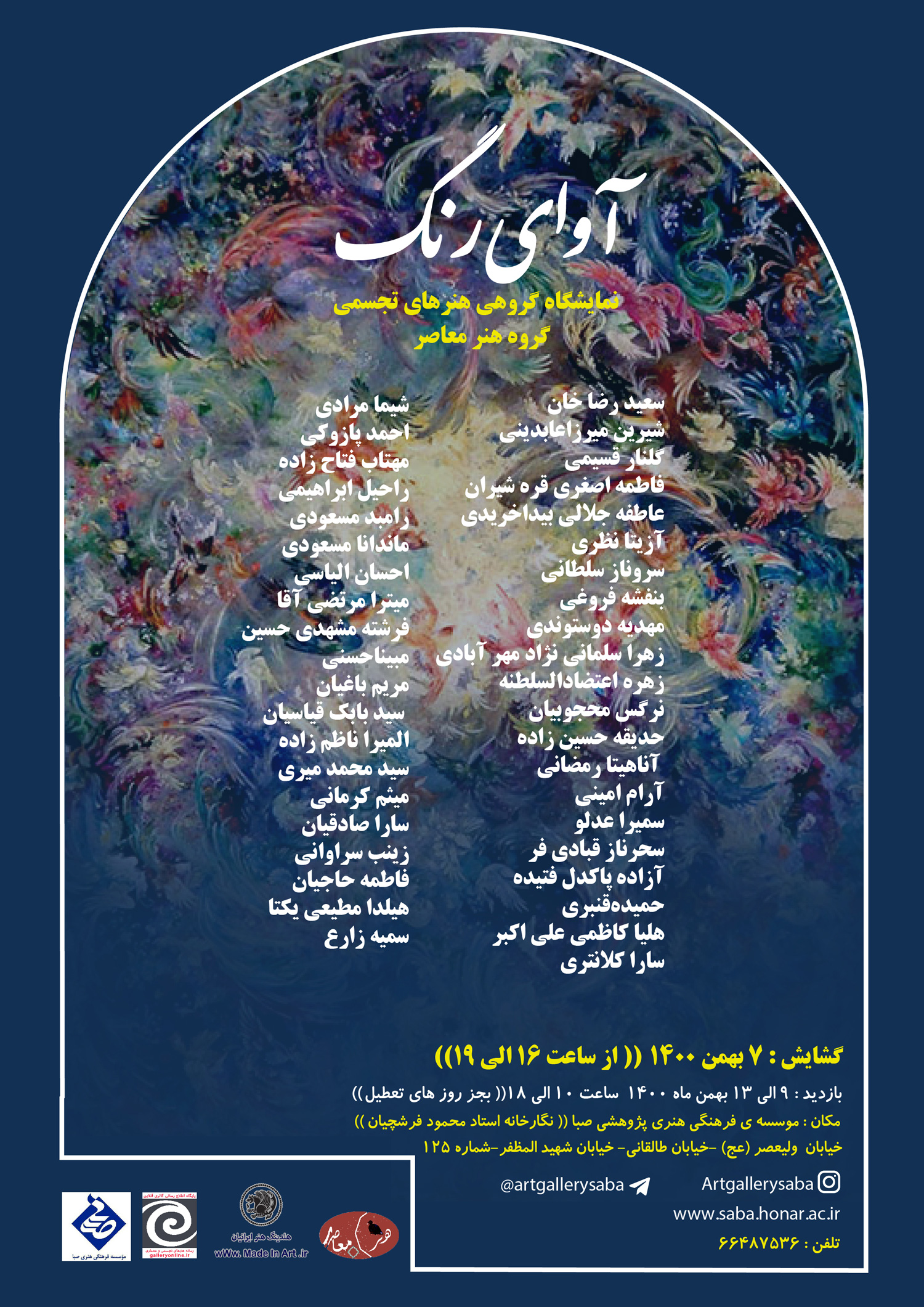 گفتني است «آواي رنگ» تا 13 بهمن، همه روزه از 10 تا 18 در گالري فرشچيان صبا، ميزبان عموم علاقمندان نوآوريها، تجربه ها و نگاههاي تازه در هنر معاصر خواهد بود.