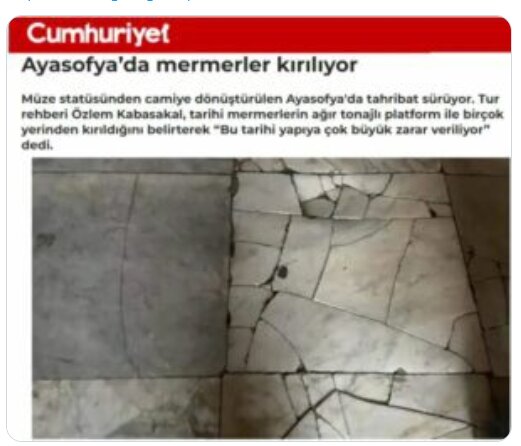 تعدادي از کاشيهاي مرمر کف بناي تاريخي اياصوفيه در استانبول توسط ماشينآلات سنگين مورد استفاده براي تميز کردن ساختمان، ترک خورده است.