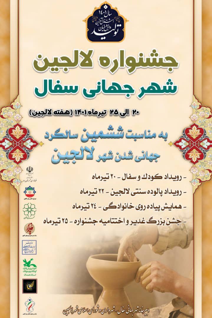 بهگزارش گالري آنلاين به نقل از خبرگزاري صدا و سيما، سيدرضا موسوي، دبير شهر جهاني سفال گفت: در شهر لالجين برنامههاي متنوعي تحت عنوان جشنواره کودک و سفال، پالوده سنتي لالجين، همايش پيادهروي خانوادگي، جشن بزرگ غدير و اختتاميه جشنواره جشن جهاني با حضور مسئولان استاني و با دعوت از شهرداران شهرهاي جهاني کشور، همزمان با عيدسعيد غدير برگزار خواهد شد.