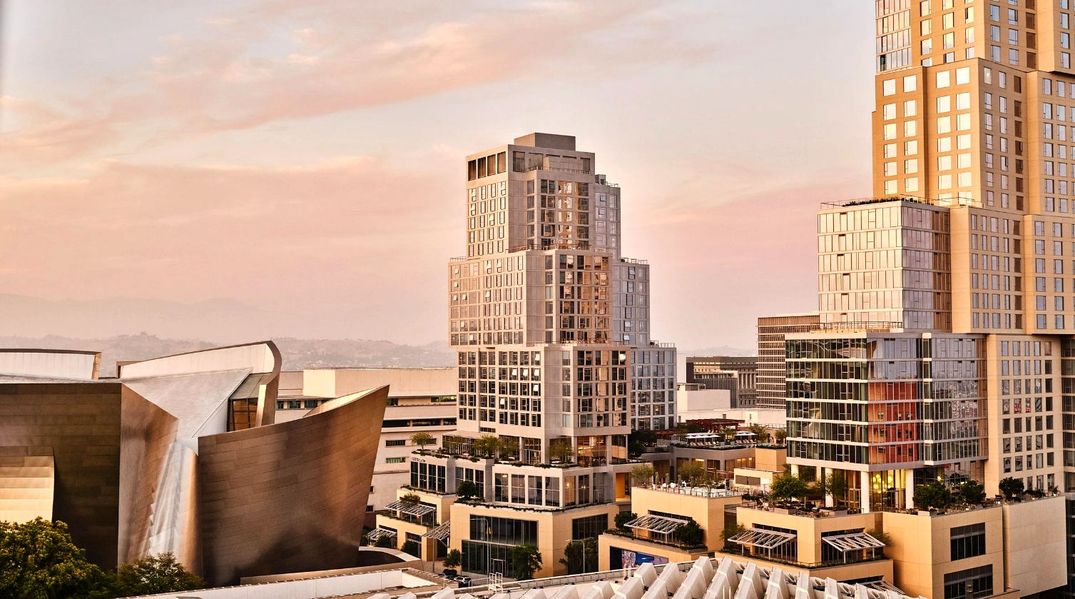 در اين بنا سازههاي دو وجهي از پايهاي بيرون ميآيند که فضاهاي خردهفروشي و ساير امکانات را در خود جاي داده، در حالي که يک حياط بيروني بزرگ بين دو ساختمان به سمت سالن کنسرت والت ديزني ديده ميشود. هر دو برج با اضلاع مکعب و با نماي Lشکل براي قاببندي حياط مرکزي طراحي شده است.