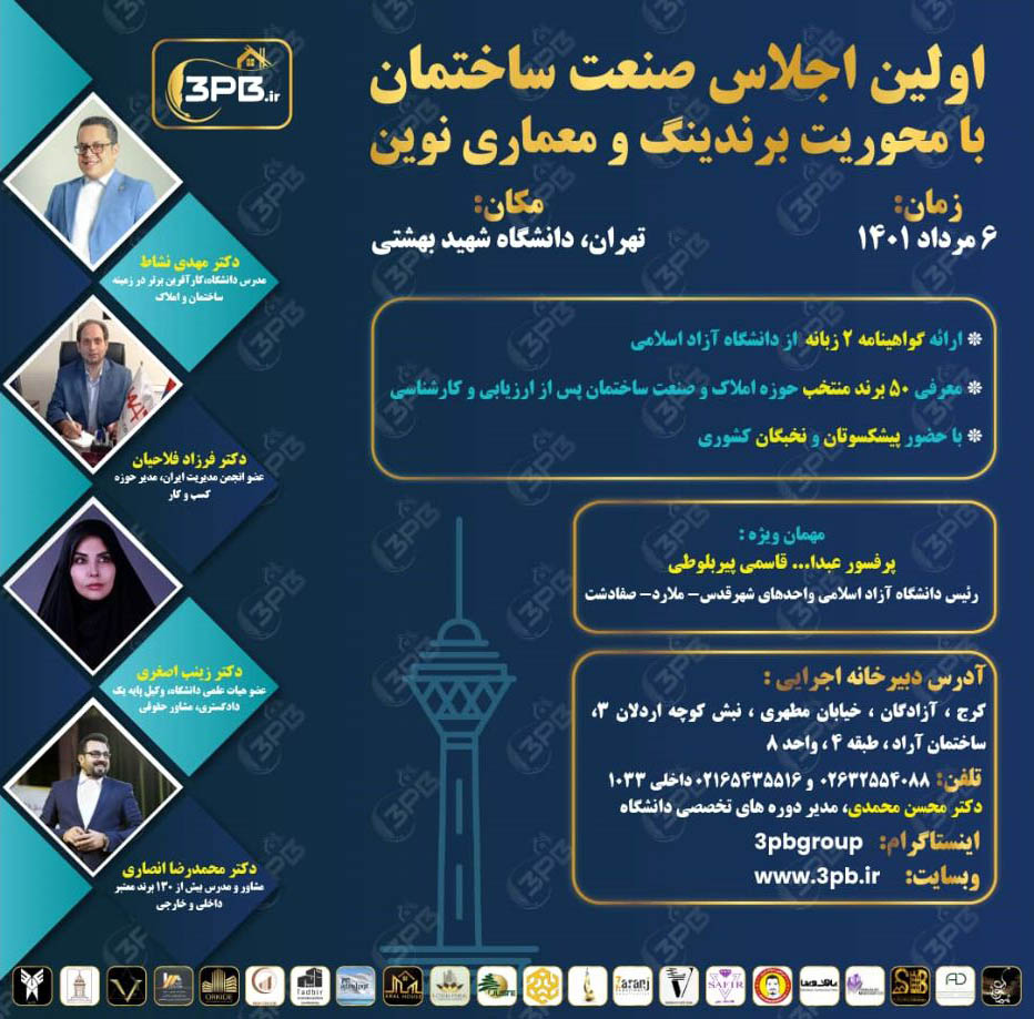 نخستين اجلاس صنعت ساختمان با محوريت برندسازي و معماري نوين پنجشنبه ششم مرداد از ساعت ۱۵ در تالار ابوريحان دانشگاه شهيد بهشتي برگزار ميشود.