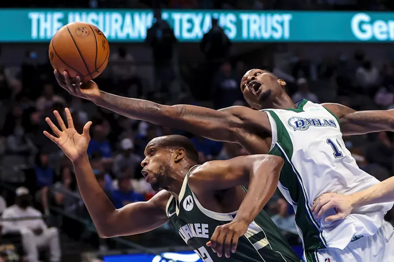 دوريان فينياسميت از تيم دالاس ماوريکز توپ را از مقابل کريس ميدلتون، مهاجم ميلواکي باکس تصاحب ميکند. اين بازي در ورزشگاه امريکن ايلاينز سنتر دالاس در تگزاس برگزار شد.