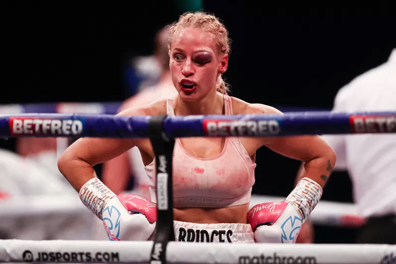 چشم مصدوم اباني بريجز استراليايي در مبارزه بر سر قهرماني خروسوزن دبليوبياي مقابل شنون کورتاني از بريتانيا. بريجز اين مسابقه را که آوريل ۲۰۲۱ در لندن برگزار شد، واگذار کرد.