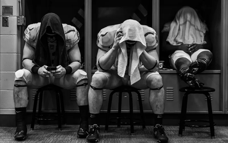 بازيکنان «آرمي بلک نايتز»، نمايندههاي آکادمي ارتش آمريکا، قبل از بازي مقابل «ميدشيپمن» از آکادمي نيروي دريايي آمريکا در رختکن نشستهاند. بازي در ورزشگاه متلايف نيوجرسي بود.