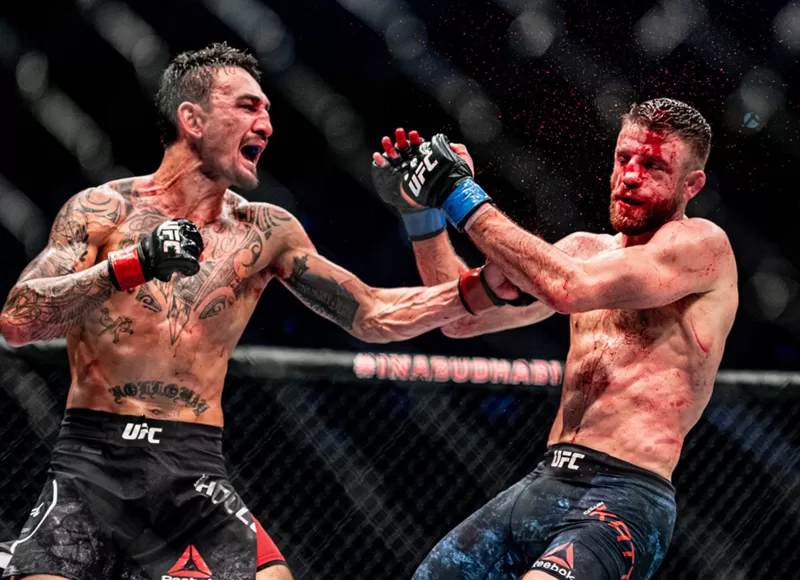 مکس هالووي (چپ) در حال ضربه زدن به کوين کاتر در مسابقات دسته پروزن يوافسي در جزيره ياس امارات متحده عربي. هالووي اين مسابقه را برد.