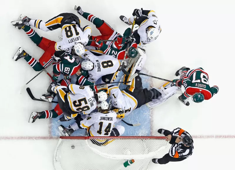 بازيکنان تيم پنگوئنهاي پيتربورو از دروازهشان در برابر تيم شياطين نيوجرسي در ليگ ملي هاکي آمريکا دفاع ميکنند. اين مسابقه در ورزشگاه پرودنشال سنتر نيوجرسي برگزار شد و پنگوئنها حريفشان را ۱-۳ شکست دادند.