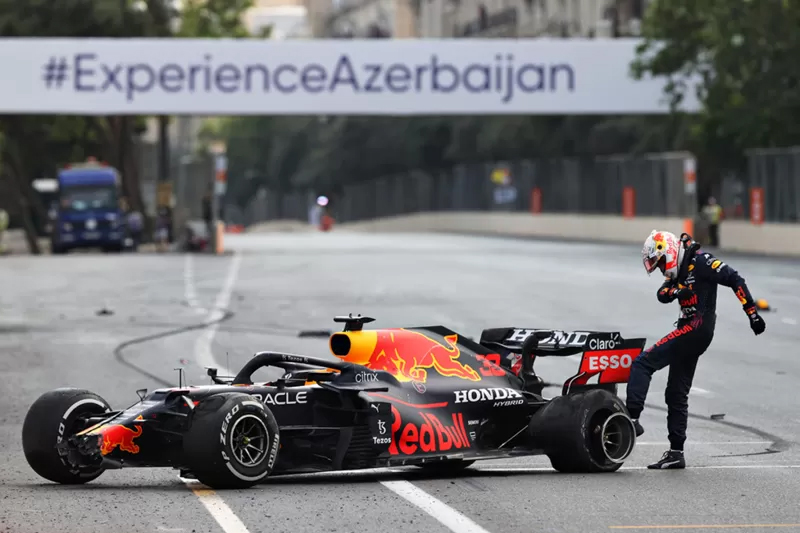مکس فرشتاپن از تيم رد بول در حال لگد زدن به لاستيک ماشينش پس از تصادف در گراندپري آذربايجان در شهر باکو.