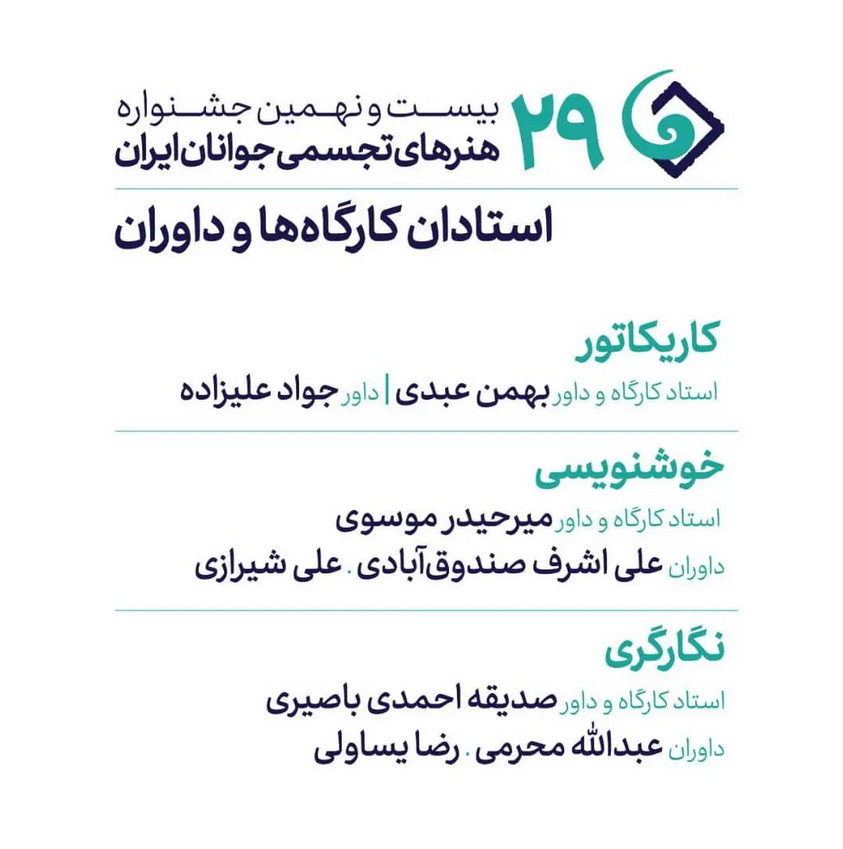 به گزارش گالري آنلاين به نقل از واحد ارتباطات و رسانه بيست و نهمين جشنواره هنرهاي تجسمي جوانان ايران، داوران و اساتيد جشنواره بيست و نهم در سه رشته کاريکاتور، خوشنويسي و نگارگري معرفي شدند.