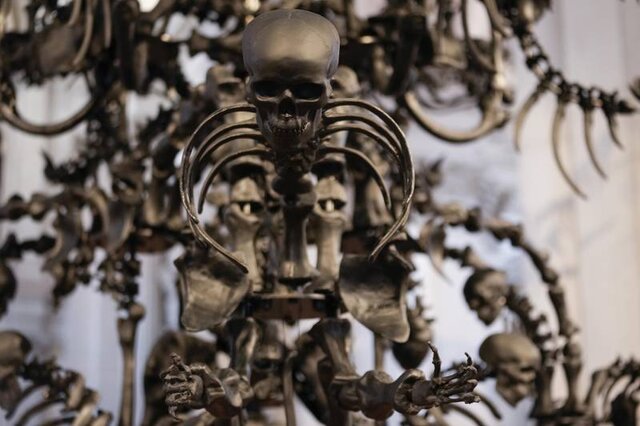 «کمدي انساني» در حقيقت از ۲,۰۰۰ قطعه شيشه دستساز تشکيل شده است که به شکلهايي همچون جمجمه انسان، اسکلت، اعضاي داخلي بدن، استخوان، خرچنگ، خفاش و دوربينهاي مداربسته ساخته شدهاند.