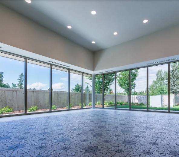 در سالن اصلي، سقف زرد روشن با پنل‌هاي سياه آويزان شده تا توجه بيننده را به الگوهاي پيچيده جلب کند. در سراسر فضاي متقارن، پنجره‌ها چشم‌اندازي از باغ‌هاي اطراف را نيز فراهم مي‌کنند. همچنين در پشت بام يک تراس تعبيه شده که در ماه‌هاي گرم‌تر سال منظره‌اي از باغ‌ها و محوطه دانشگاه را براي مخاطبان به نمايش مي‌گذارد.