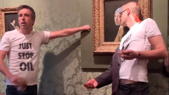 ويدئويي که در فضاي مجازي منتشر شده است، دو مرد را نشان ميدهد که پيراهني با عبارت «استفاده از نفت را متوقف کنيد» بر تن دارند و مقابل اين نقاشي ايستادهاند. يکي از اين افراد سعي دارد سرش را به نقاشي بچسباند و در همين حين فرد ديگر يک قوطي سوپ گوجهفرنگي را بر سر ديگر معترض ميريزد.