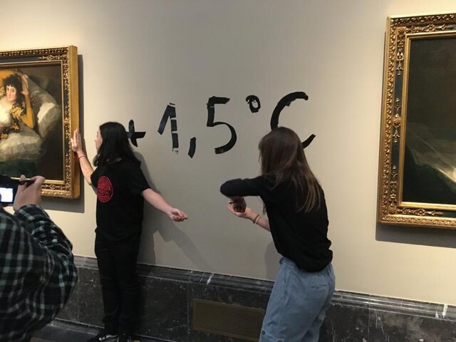 با تداوم حمله معترضان محيط زيستي به آثار هنري مشهور جهان، اين بار موزهاي در مادريد هدف حمله قرار گرفت و دو فعال محيطزيست دستانشان را با چسب به قاب دو نقاشي اثر «فرانسيس گويا» نقاش نامدار اسپانيايي چسباندند.