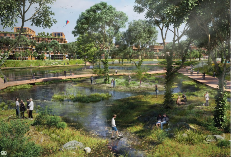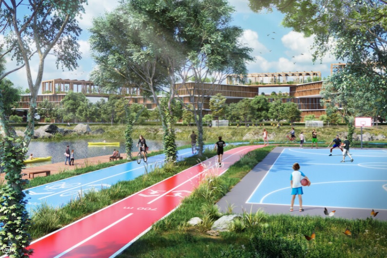 فضاهاي سبز قلب و شريان کل توسعه منطقه هستند. اين منطقه به عنوان محورمرکزي، يک ستون فقرات سبز چند منظوره به طول پنج کيلومتر و ۱۲ منطقه بيوفيليک با کاربري مختلط را ادغام مي‌کند تا ساکنين درعرض چند دقيقه با پياده‌روي، دوچرخه‌سواري يا وسايل نقليه الکتريکي به مراکز داخل شهر متصل مي‌کند.