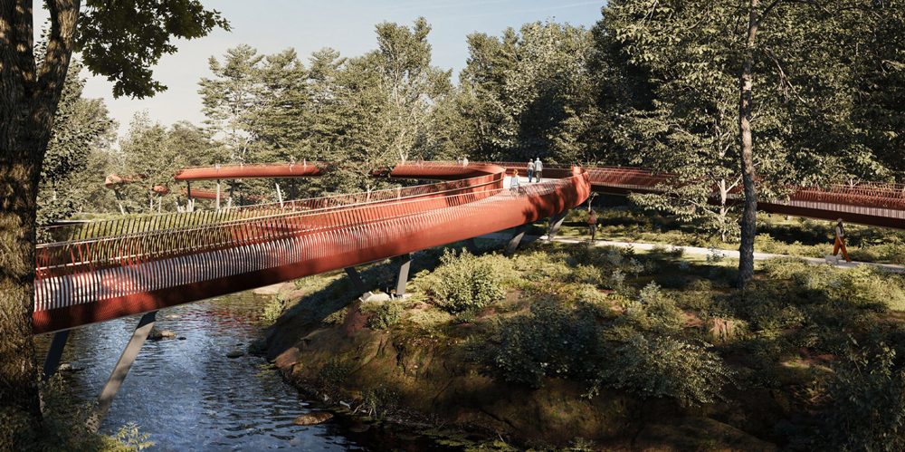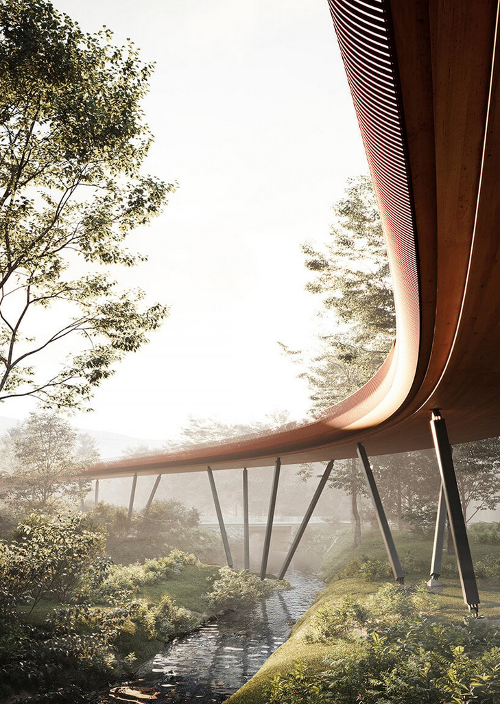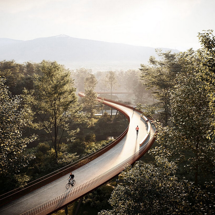 به گزارش گالري آنلاين، پس از يک مسير مرتفع، ساختار منحني خطي يک پيوند ميان مسير عابر پياده و دوچرخه سواري فراهم مي کند که هر دو نيمه اين استراحتگاه سبز گسترده را به هم متصل مي کند. همانطور که بازديدکنندگان در امتداد سازه قدم مي زنند، مناظر جنگل ها و کوه هاي اطراف باز مي شوند.