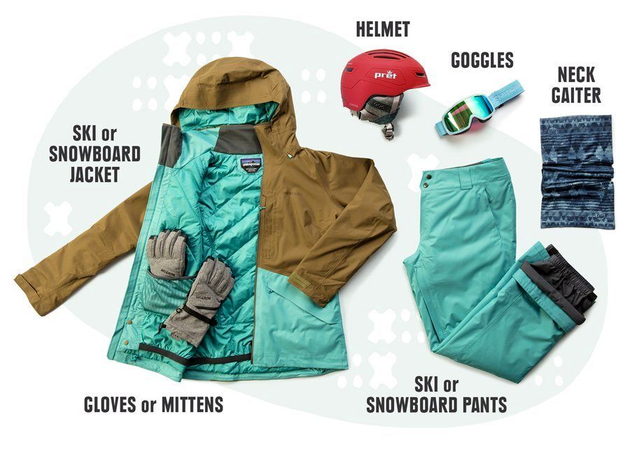 زيرپوش بلند، رويه پشمي، جوراب اسکي يا اسنوبرد، ژاکت اسکي يا اسنوبرد، شلوار اسکي يا اسنوبرد، دستکش، کلاه ايمني، عينک ايمني و گِتر گردن از جمله اين اقلام پوشيدني هستند.