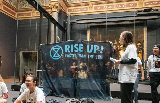 به گزارش گالري آنلاين، ايسنا به نقل از آرتنيوز نوشت، روز يکشنبه دو معترض محيطزيستي بنري با تصويري تغيير يافته از «گشت شبانه» نقاشي معروف هلندي را در مقابل نسخه اصلي اين نقاشي در موزه ملي آمستردام در دست داشتند. اين تصوير تغييريافته که نگهبانان شب را غرق در آب نشان ميداد ، اشاره مستقيمي به شعار اين گروه محيط زيستي بود: هيچ هنري در سيارهاي وجود ندارد که آن را سيل گرفته است.
