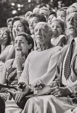 پابلو پيکاسو با همسرش فرانسوا ژيلو و پسرش کلود در يک رويداد گاوبازي، ۱۹۵۵