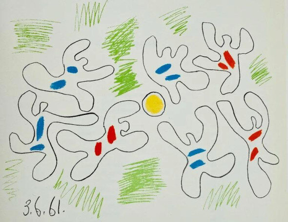 اثر ديگري از پيکاسو با همين موضوع، نقاشي «فوتبال» است که سال ۱۹۶۱ کشيده شد. در مرکز يک توپ زرد قرار دارد که بازيکنان به دنبالش ميدوند. بازيکنان هيچ ويژگي مشخصي به جز لباسهاي آبي و قرمز ندارند.