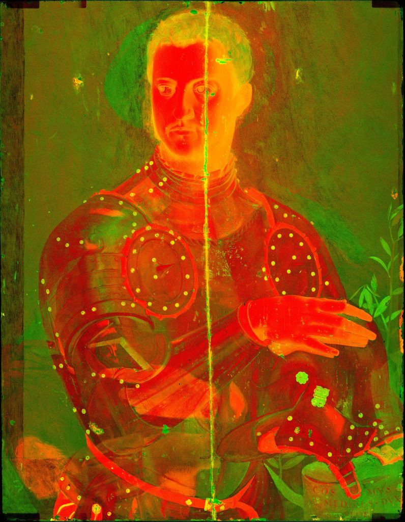 ايوز به Artnet گفت: اين روش ما را قادر ميسازد تا تواليهاي کاربرد رنگ را کاملاً درک کنيم. هنرمندان دوره رنسانس با رنگهايي کار ميکردند که حاوي مواد معدني بودند – قلع به رنگ زرد، جيوه به رنگ قرمز، مس به رنگ آبي عميق – که تصويربرداري پيشرفته ميتواند آن را تشخيص دهد. نتايج نشان داد که برونزينو در ابتدا کوزيمو مديچي را به عنوان يک محقق به تصوير ميکشد که کلاهي بر سر دارد و کتابي در دست دارد.