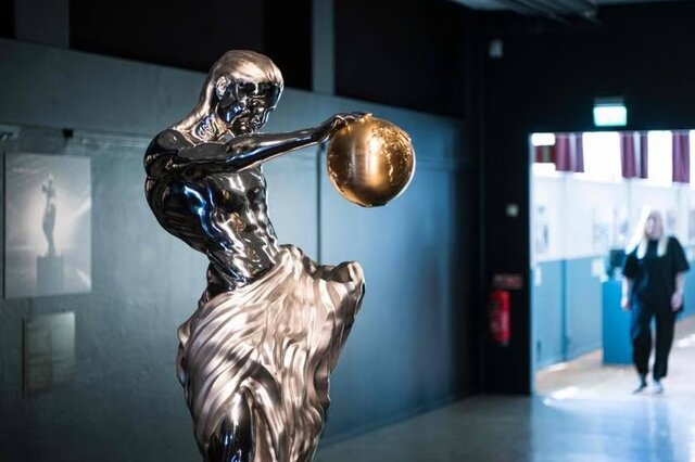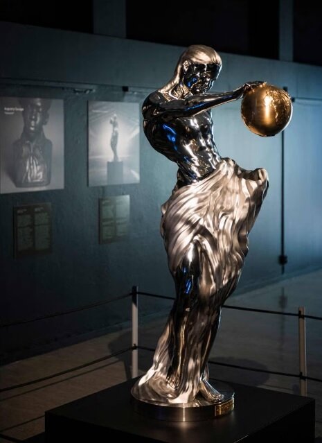 اين مجسمه استيل که مفاهيم سنتي درباره خلاقيت و هنر را به چالش کشيده است، فردي را به تصوير کشيده است که يک گوي برنزي را در دست دارد.
