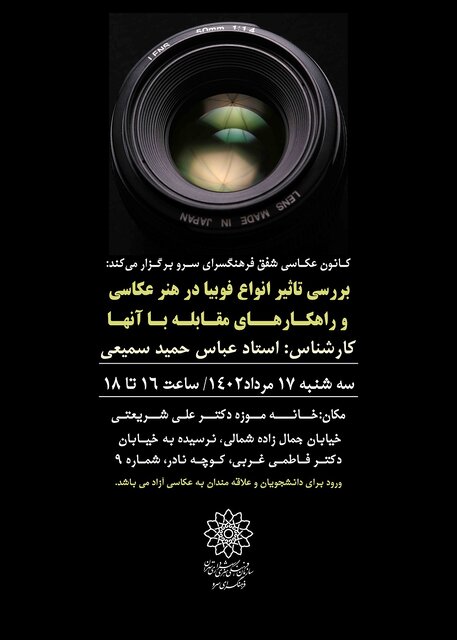تأثير انواع فوبيا در هنر عکاسي و راهکارهاي مقابله با آنها قرار است طي برگزاري يک کارگاه در خانه موزه دکتر علي شريعتي بررسي شود.