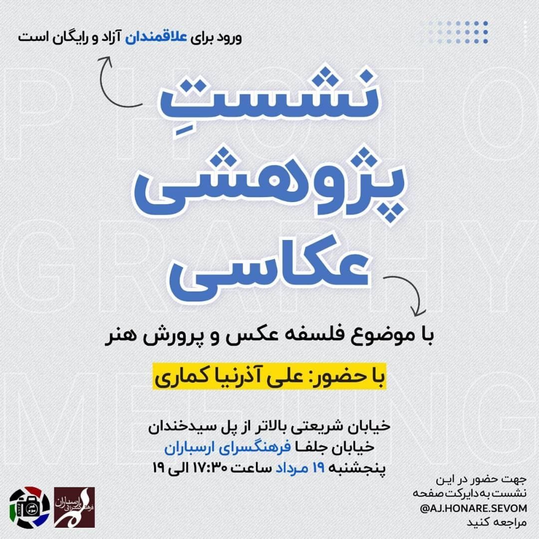 نشست پژوهشي عکاسي با موضوع فلسفه عکس و پرورش هنر پنجشنبه ۱۹ مردادماه از ساعت ۱۷:۳۰ تا ۱۹ در فرهنگسراي ارسباران برگزار ميشود.