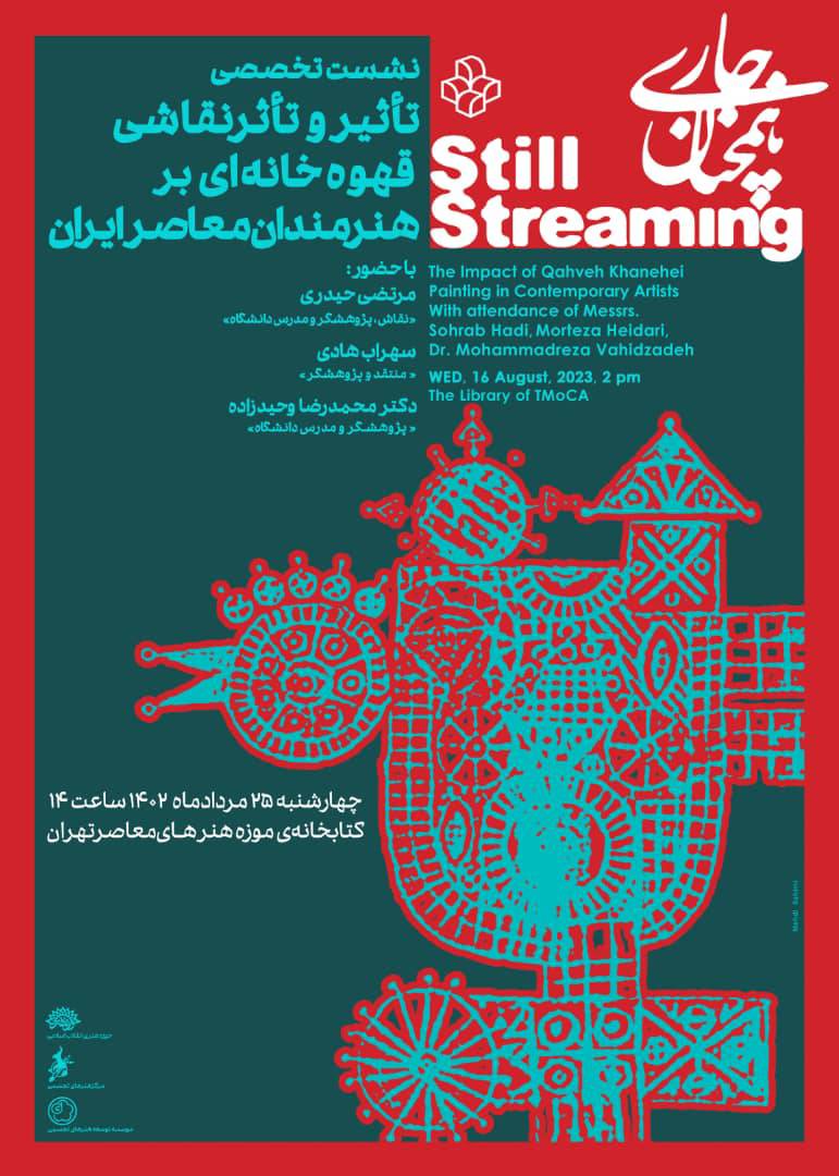 به گزارش گالري آنلاين به نقل از واحد ارتباطات و رسانه اداره کل هنرهاي تجسمي وزارت فرهنگ و ارشاد اسلامي به نقل از روابط عمومي موزه هنرهاي معاصر تهران، سومين نشست از سلسلهنشستهاي تخصصي نمايشگاه «همچنان جاري» با عنوان «تأثير و تأثر نقاشي قهوهخانهاي بر هنرمندان معاصر ايران»، چهارشنبه ۲۵ مرداد، ساعت ۱۴ در موزه هنرهاي معاصر تهران برگزار ميشود.
