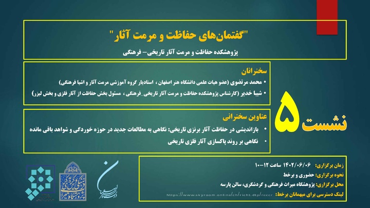 پنجمين نشست از سلسله نشستهاي «گفتمانهاي حفاظت و مرمت آثار» 6 شهريور 1402 ساعت 10 تا 12 بصورت حضوري و بر خط در محل پژوهشگاه برگزار ميشود.