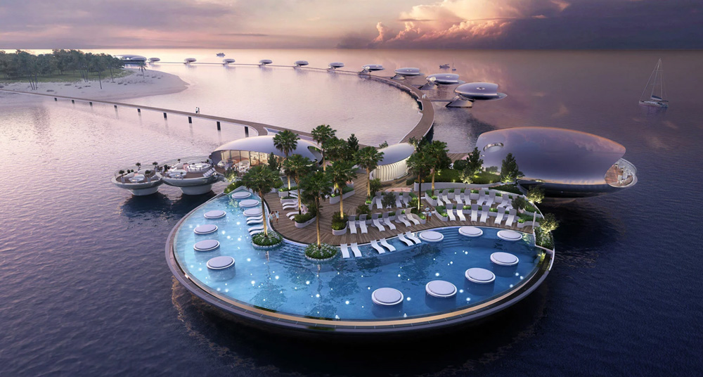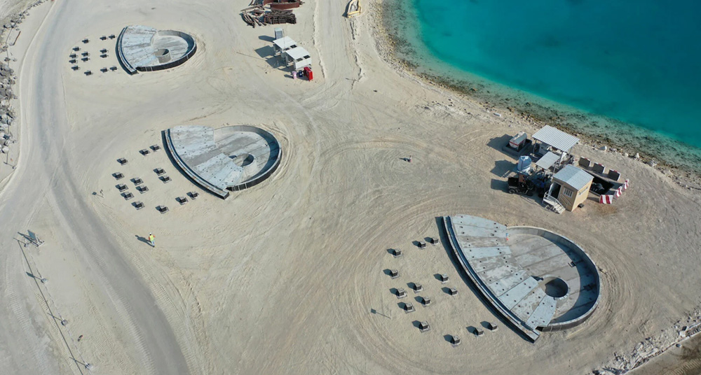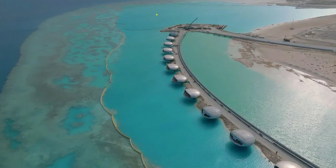 تيم Red Sea Global پروژه ساخته شده در جزيره را به عنوان "چيزي که قبلاً هرگز ساخته نشده است" توصيف مي کند. آنها از Killa Design مستقر در دبي استفاده کرده اند تا واحدهاي اقامتي را براي جايي که آنها يکي از جاه طلبانه ترين جزاير خود مي دانند توسعه دهند. ويلاها به شکل گوي هاي فولادي آينده شکل مي گيرند که در بالاي سطح آب شناور هستند و دريا، آسمان و صخره هاي زيرين را منعکس مي کنند. اين طرح نشانه هاي خود را از محيط طبيعي اطراف جزيره، به ويژه مرجان ها گرفته و باعث ايجاد جلوه دايره اي مي شود. اين موتيف دايره اي به عنوان نمادي براي وحدت و يکپارچگي عمل مي کند. از سوي ديگر، ويلاهاي داخلي به گونهاي طراحي شدهاند که يادآور تپههاي ماسهاي بياباني گسترده باشند که بهطور متفکرانهاي در موقعيتي قرار گرفتهاند تا حس حريم خصوصي را براي مهمانان فراهم کنند.