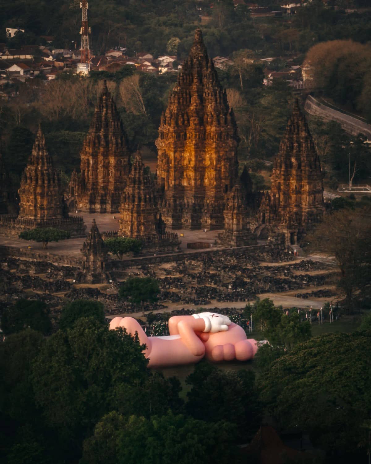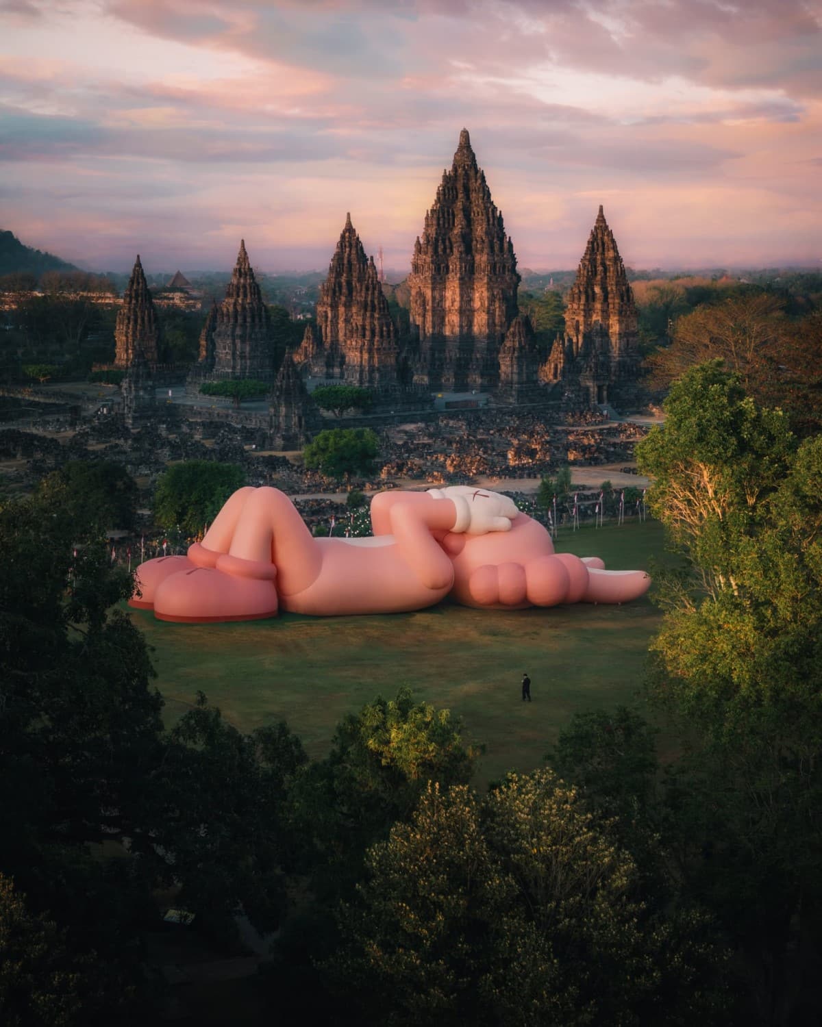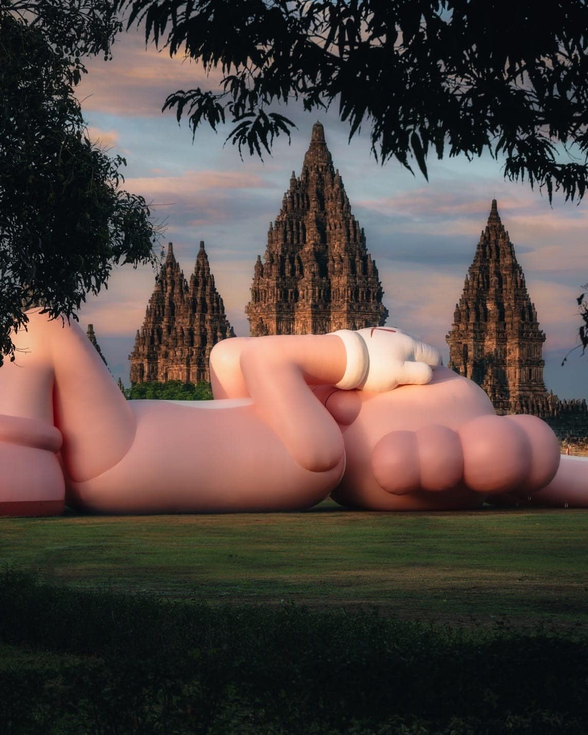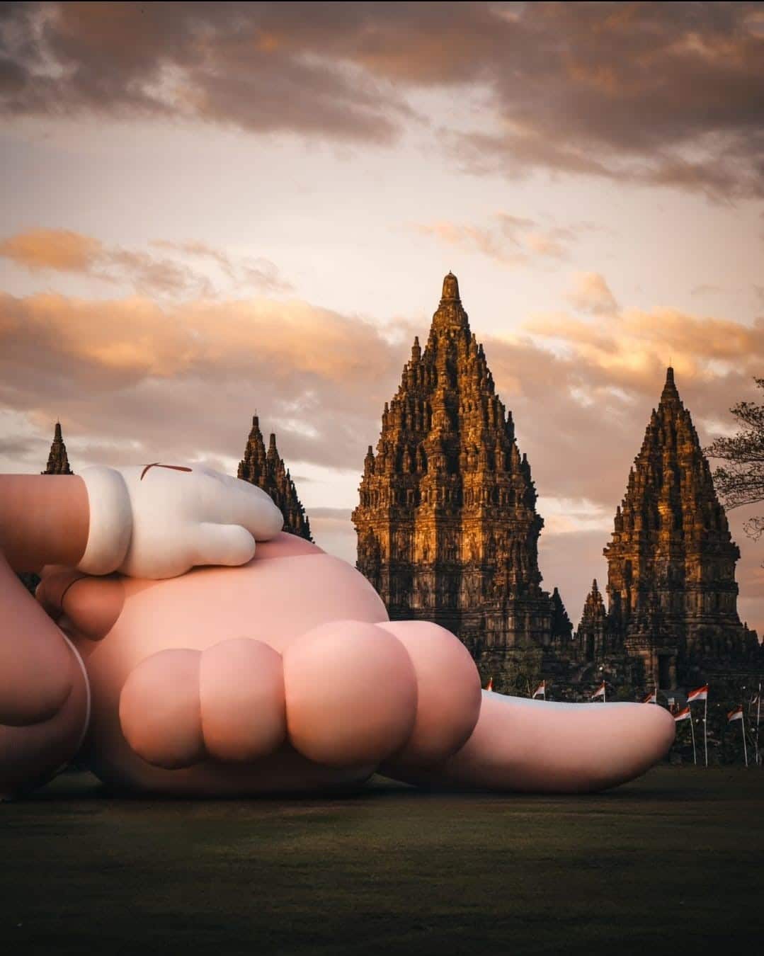 به گزارش گالري آنلاين، مجسمه هاي بزرگي از شخصيت هاي او قبلاً به شهرهايي مانند هنگ کنگ، ملبورن، سنگاپور و بريستول سفر کرده اند. اما اکنون، KAWS با نصب خود در معبد Prambanan اندونزي، يک سايت ميراث جهاني يونسکو را فتح کرده است. اين معبد هندو متعلق به قرن نهم درست خارج از Yogyakarta قرار دارد و محيطي چشمنواز براي ACCOMPLICE فراهم ميکند که KAWS اولين بار در سال 2002 به عنوان يک فيگور وينيل معرفي شد. خرگوش صورتي 150 فوتي در ميان چمنها پيش روي معبدي که بهخاطر حکاکيهاي پيچيدهاش معروف است، دراز کشيده است. اين بزرگترين مجسمه هنرمند ساکن بروکلين تا به امروز است و توسط همکار قديمي AllRightsReserved سازماندهي شده است.