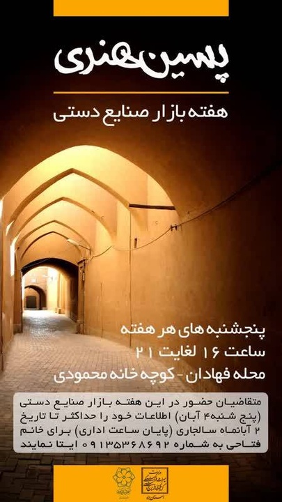 معاون صنايع‌دستي استان يزد از برگزاري هفته بازار صنايع‌دستي با عنوان پسين هنري در بافت تاريخي يزد خبر داد.