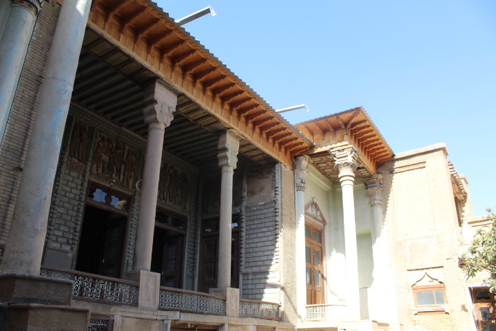 مديرکل ميراثفرهنگي، گردشگري و صنايعدستي استان فارس گفت: در ضلع جنوبي که ورودي بنا در آن قرار دارد، شاهنشين ستوندار سنگي و تالار آيينه واقع شده است، فضاي داخلي شاهنشين داراي نقوش گچبري برجسته با تقليد از نقش برجستههاي تخت جمشيد تزيين و درهاي به کار رفته در شاهنشين و تالار آيينه به صورت معرقکاري ساده تزيين شده است.