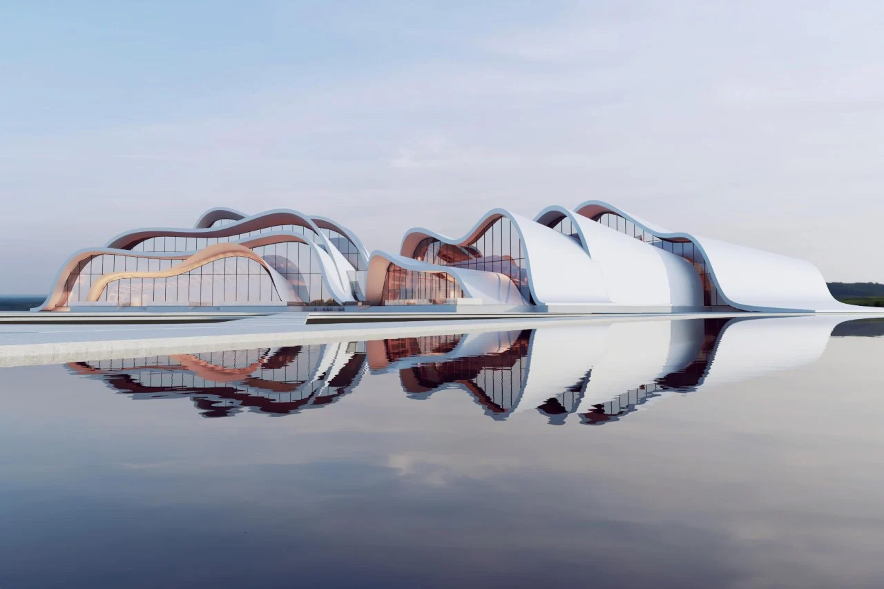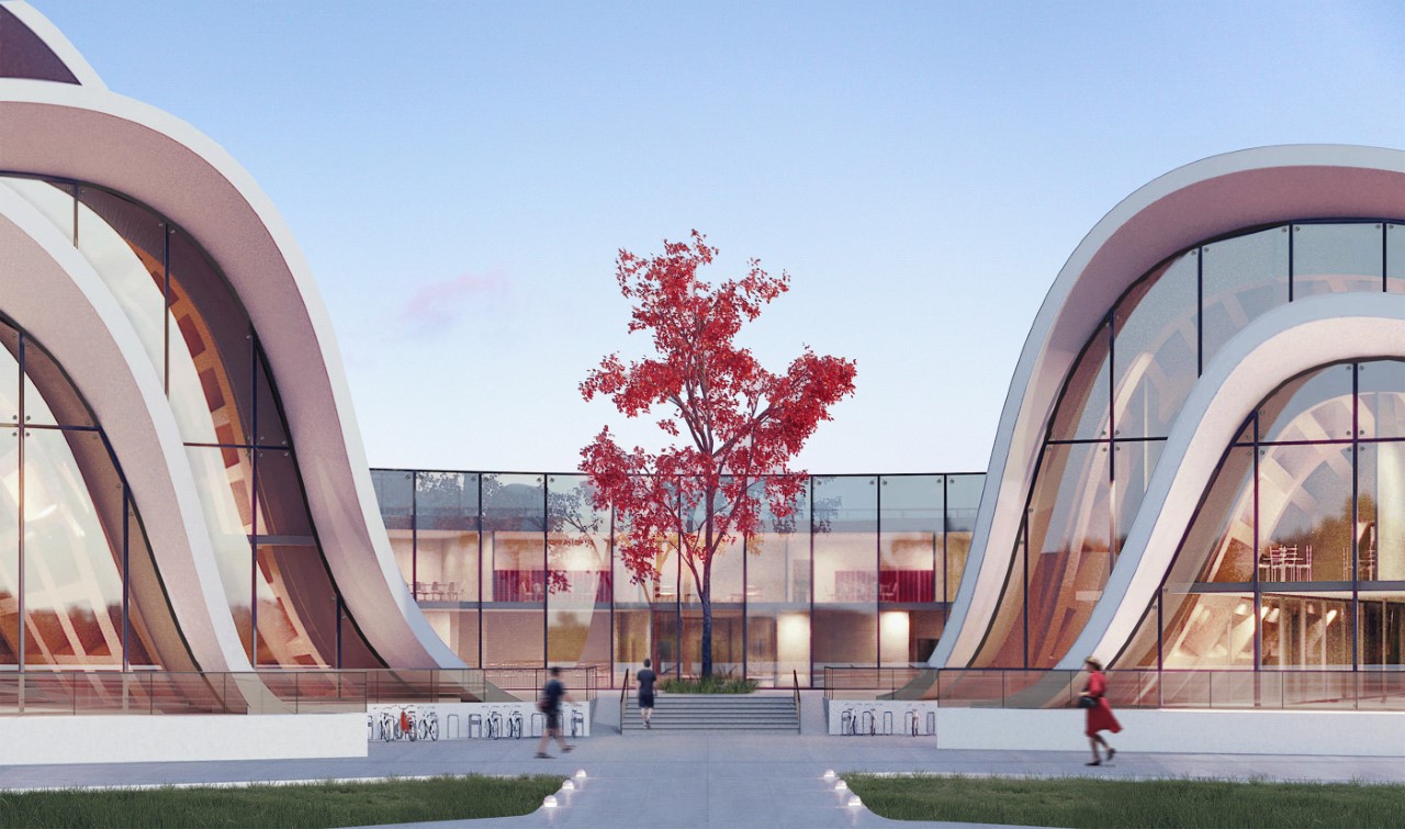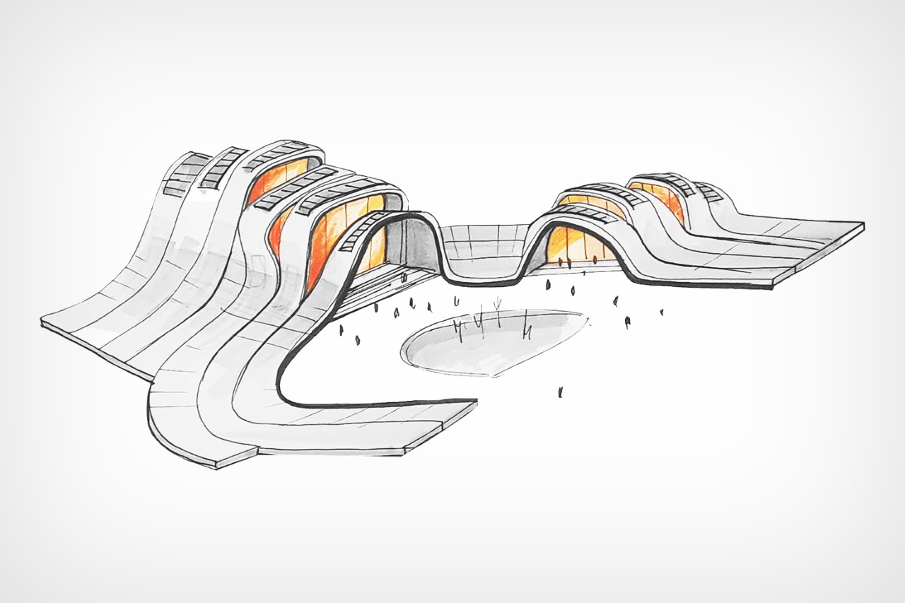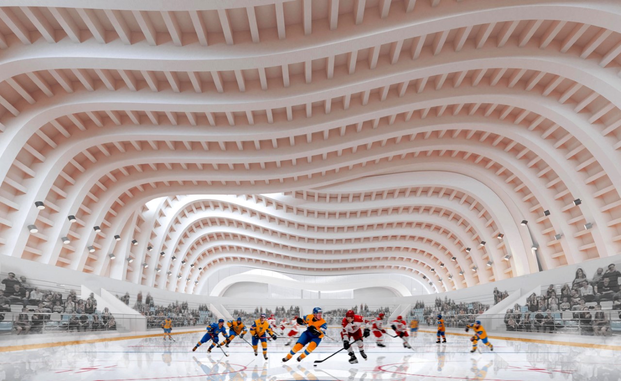 به گزارش گالري آنلاين، ويژگي برجسته طرح معماري فوق سيال محل برگزاري است. طراحي روان و ارگانيک به نظر مي رسد که يادآور مرکز حيدر علي اف با طراحي زاها حديد در آذربايجان است – يکي از نمادين ترين ساختمان هاي زمان ما. مرکز يخ داراي لايه هاي متعددي از نماهاي روان است که با مشاهده از جلو، جلوه اي سه بعدي ايجاد مي کند. تقريباً شبيه يک رشته کوه يا تپه هاي شني به نظر مي رسد که از طريق منحني هاي ملايم تراشيده شده شگفت انگيز خود، جلوه اي از عمق و سياليت را مي دهد. رودخانه اي در کنار اين مجموعه، انعکاس معکوس زيبايي از سازه را ارائه مي دهد، تقريباً يک موج صوتي ايجاد مي کند و عنصر «موجي» را که معمار به دنبال آن بود، تقويت مي کند.