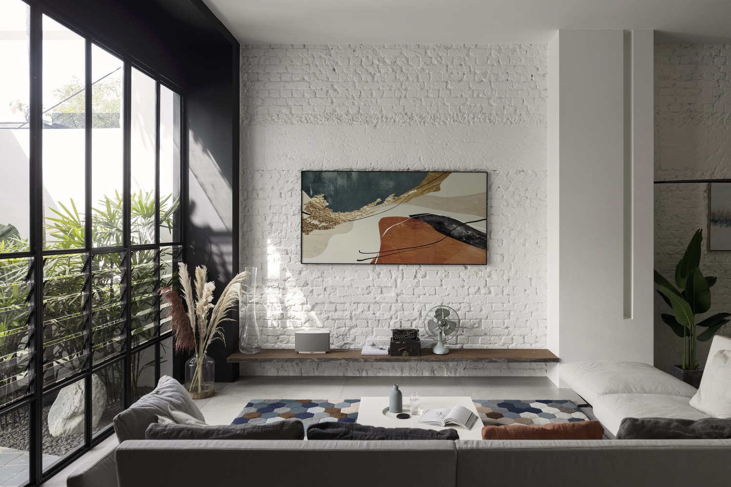 به گزارش گالري آنلاين، دهانه‌هاي مربعي با اندازه‌هاي مختلف در سمت چپ اجازه مي‌دهند نور در روز و نماي روشن در شب. به محض ورود، سقف بلند حس وسعت را القا مي کند در حالي که استفاده از کاشي هاي بزرگ همخوان در قسمت هاي نشيمن، ناهارخوري و آشپزخانه باعث افزايش وسعت بصري مي شود. يک ديوار سفيد بافت نزديک در ورودي، پس‌زمينه‌اي براي مجموعه‌اي از چراغ‌هاي عتيقه اروپايي است. سقف چوبي پايين تر و تم تيره رنگ در آشپزخانه تضاد بصري را با فضاي نشيمن و ناهارخوري ايجاد مي کند. گرانيت بافتي که هم براي بک اسپلش و هم براي جزيره طولاني استفاده مي شود، حس جالبي به آشپزخانه مي بخشد، جايي که مالکان هنگام ميزباني با خانواده و دوستان جمع مي شوند.